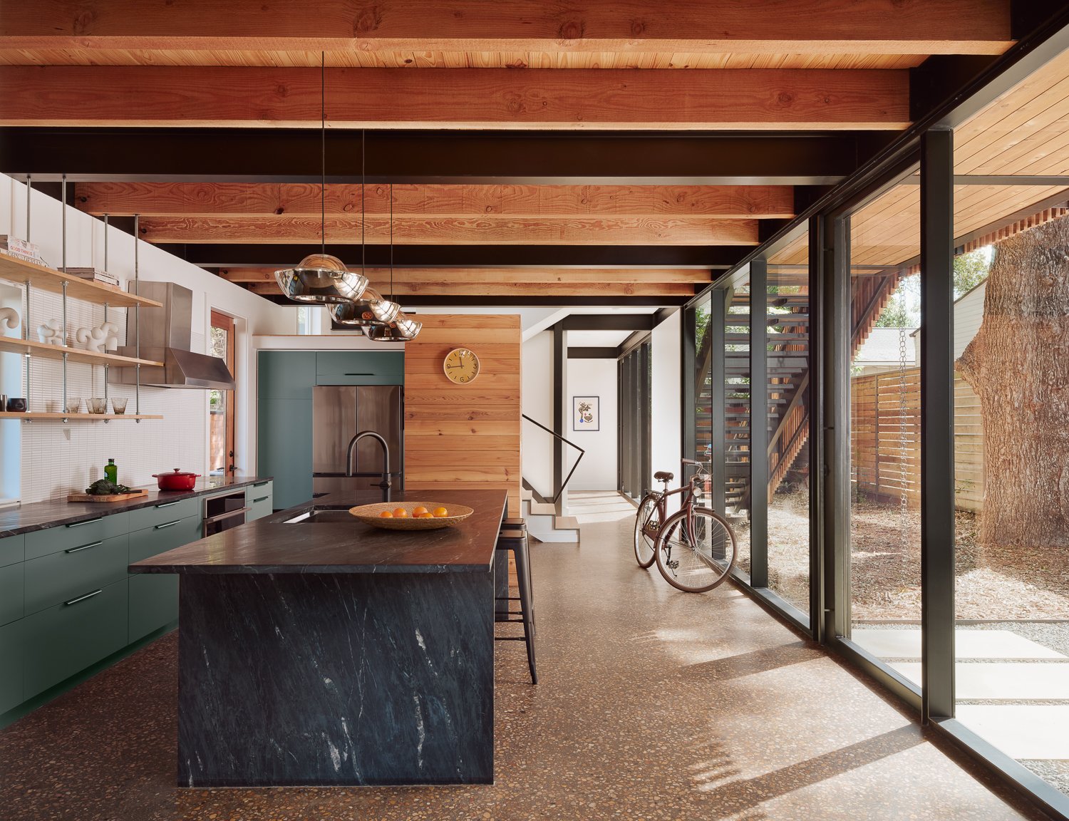 Through the use of 2 by lumber wall trusses, accounting for code-required wall bracing, the structure allows large expanses of natural light, an open plan and interlaced double height spaces throughout the residence without the need of structural steel.